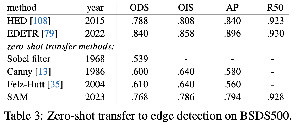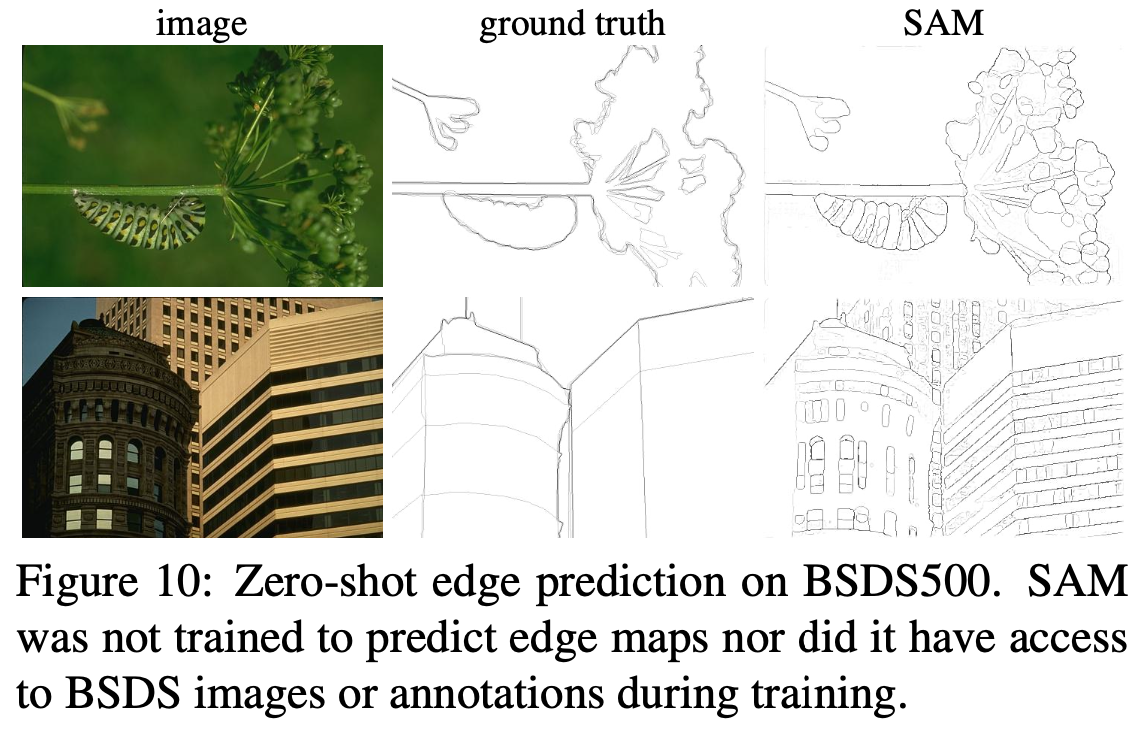 SAM은 edge detection을 위해 훈련되지 않았음에도 불구하고 합리적인 edge map을 생성하는 것을 관찰할 수 있다. 또한 실제 데이터와 비교했을 때, SAM은 BSDS500에 표기되지 않은 합리적인 edge를 포함해 더 많은 edge를 예측한다.