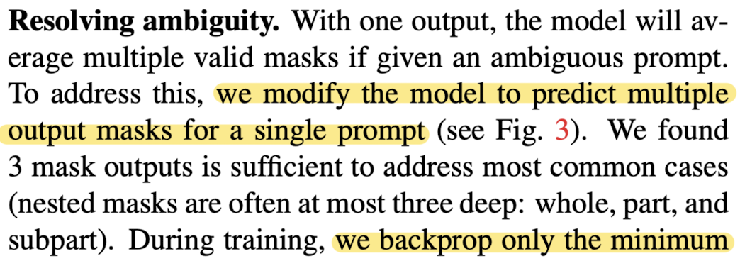 - 모델은 하나의 지점(prompt)을 주었을 때, 그 지점이 객체의 일부일 수도 있고, 전체일 수도 있는 경우를 모두 고려한다.