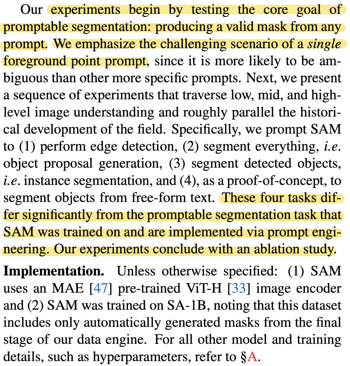 SAM은 single foreground point에서 좋은 mask를 뽑아낸다. 또한 zero-shot 전송 프로토콜의 downstream 작업(edge detection, object proposal generation, instance segmentation, and a preliminary exploration of text-to-mask prediction)에서 prompt engineering을 사용하면 좋은 결과를 얻을 수 있음을 발견했다.