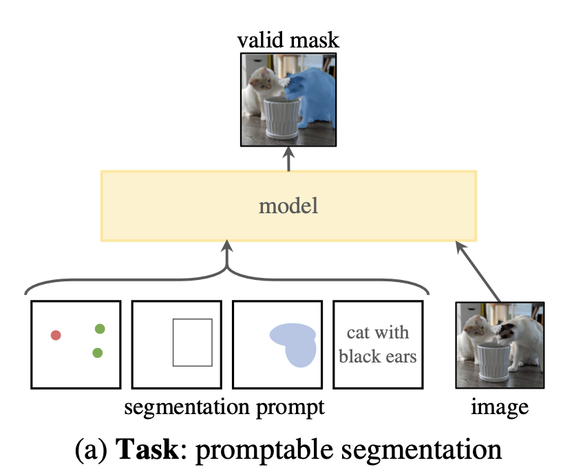 SAM의 실험 목표는 프롬프트를 통해 valid 마스크를 생성하는 것이다. 여기서 프롬프트란, 모델에게 특정 작업을 수행하도록 지시하는 입력을 의미한다. 예를 들어, 한 점의 위치를 지정하는 것만으로도 모델이 해당 위치의 객체를 세그멘테이션할 수 있어야 한다.