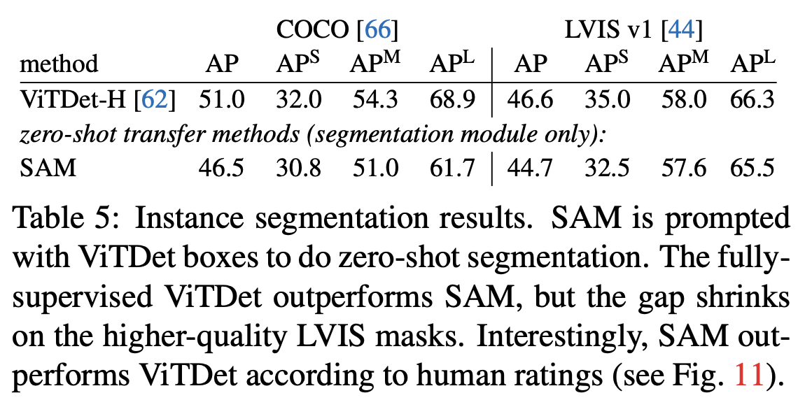 SAM이 ViTDet보다 확실히 뒤지지만 상당히 근접하다. 출력을 시각화해 보면, SAM 마스크가 ViTDet보다 질적으로 우수하고 경계가 더 선명한 경우가 많다.