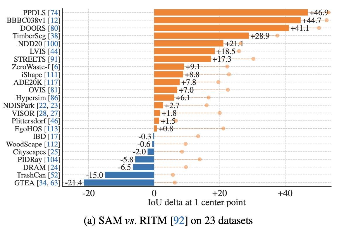먼저 23개의 새로운 데이터셋에 대해서 점 하나를 찍었을 때 마스크를 얼마나 잘 생성하는지 기존 SOTA 모델인 RITM과 비교해보았다. 그 결과, SAM은 RITM보다 23개의 데이터셋 중 16개의 데이터셋에서 최대 ∼47 IoU까지 더 높은 결과를 보였다. 위 지표의 점선과 함께 표시된 점은 SAM의 3가지 마스크 중 가장 confidence가 높은 마스크를 ground truth와 비교했을 때의 지표이다.