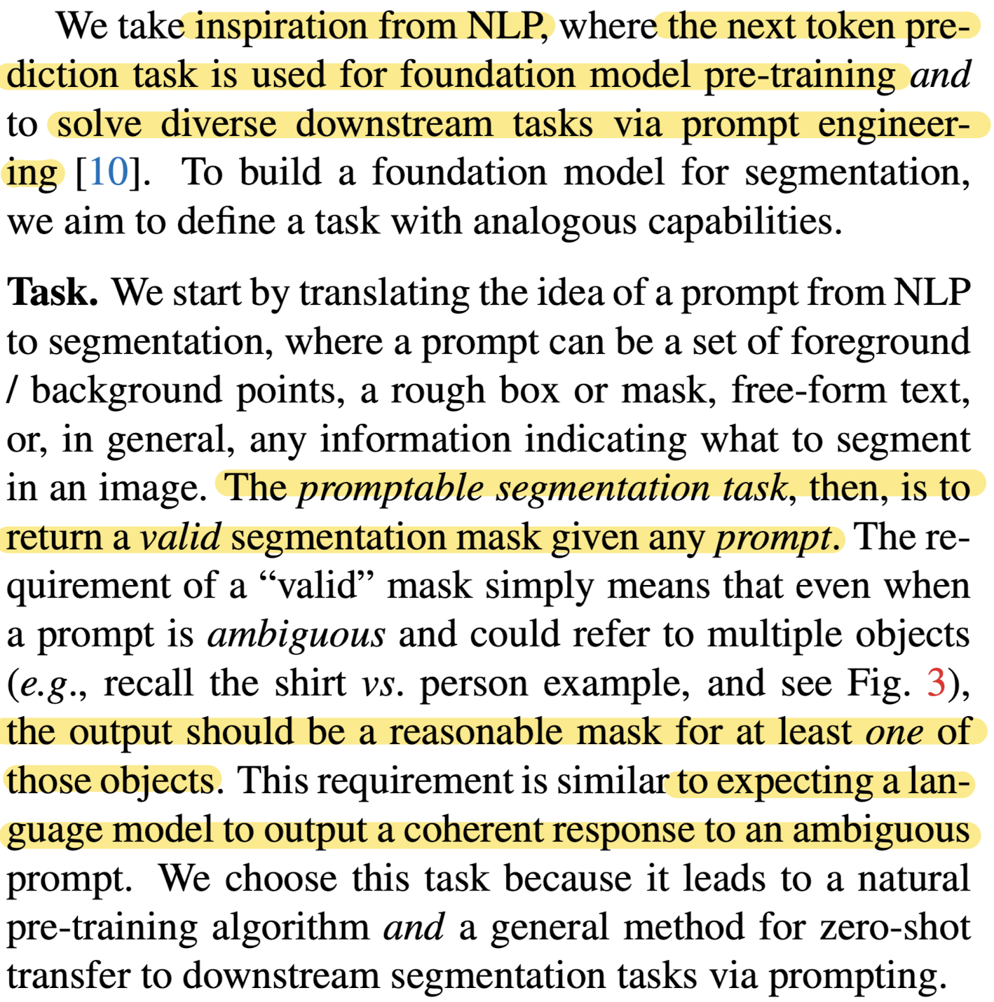 NLP에서 모델을 학습할 때, 다음 단어(토큰)를 예측하도록 하는 방법을 사용하는데 이를 segmentation에 적용하고자 했다. 이를 promptable segmentation task라고 하며, 주어진 prompt에 대해 “valid” segmentation mask를 뽑아내는 것이 목표이다. 여기에서 valid란, prompt가 모호하고 여러 물체를 참조하고 있어도, output은 물체들 중 적어도 하나에 대해 reasonable한 mask여야 한다는 것이다.
